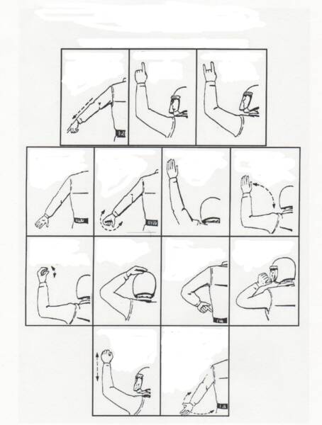 Arm positioned as for right turn, forearm swung toward shoulder.
